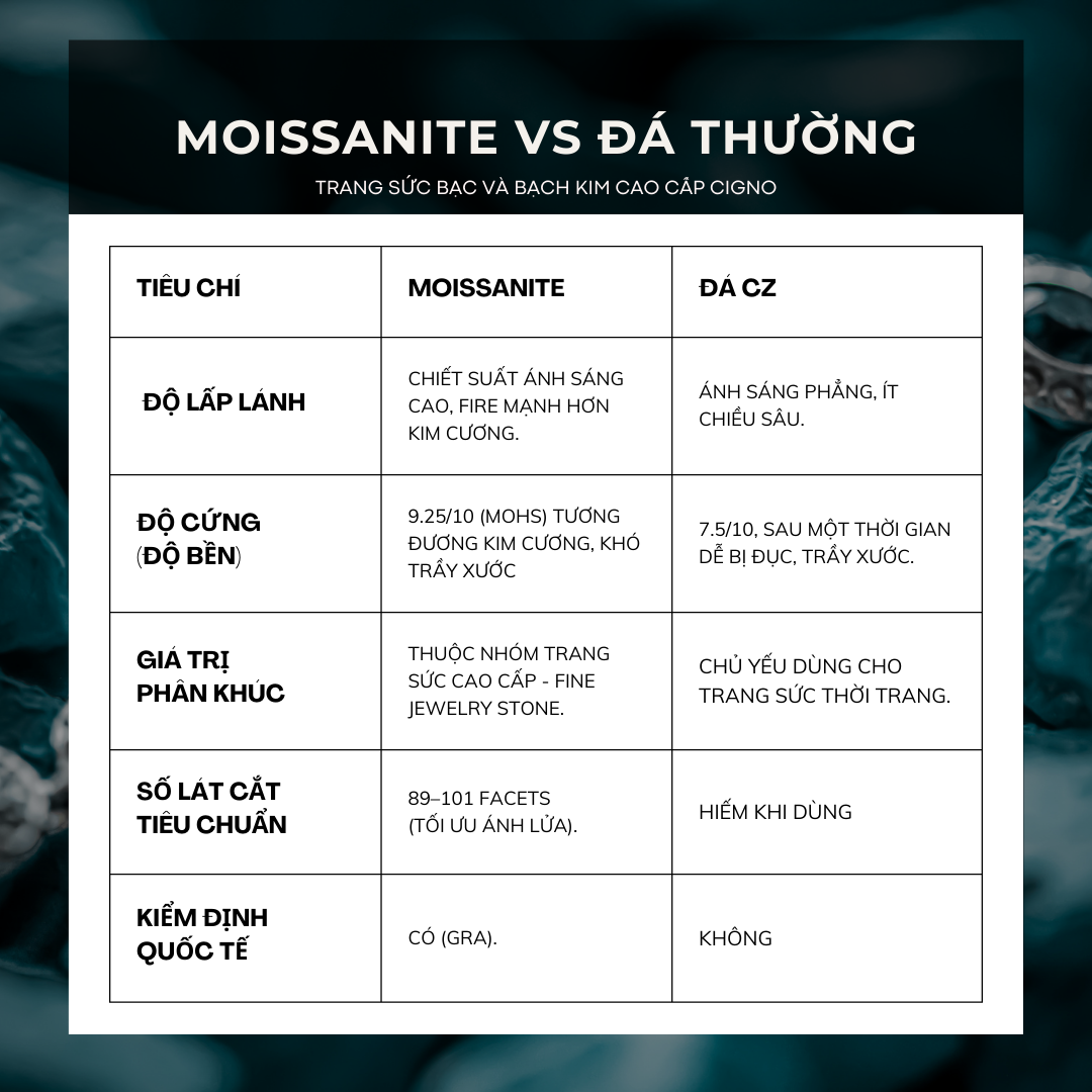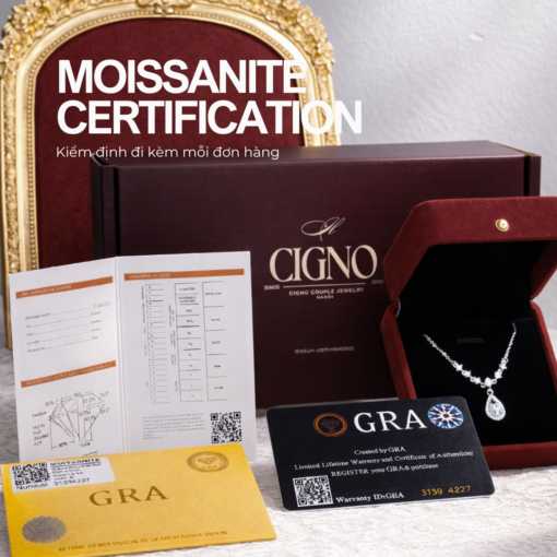 - Đá quý Moissanite độ cứng 9,5/10 trên thang Mohs được phân loại và chứng nhận bởi GRA – Hiệp hội Nghiên cứu Ngọc học Mỹ.